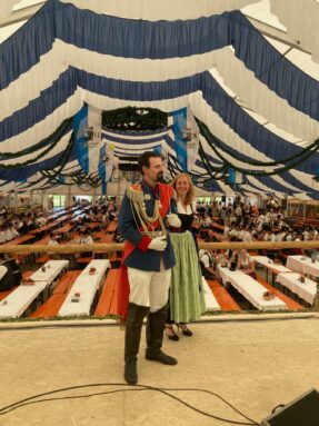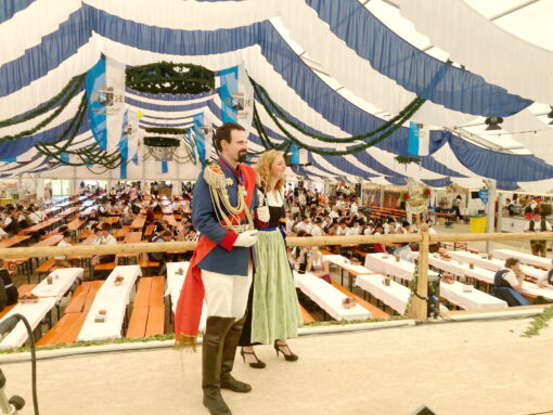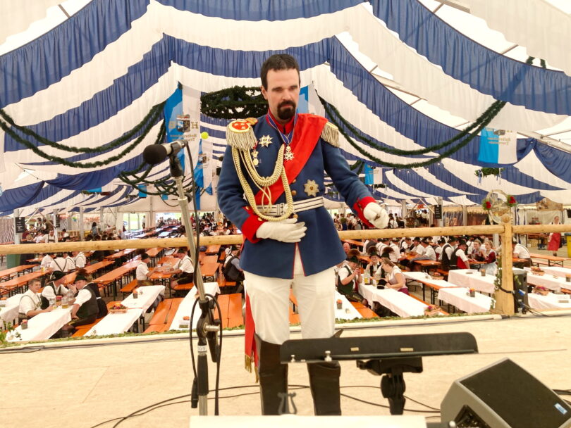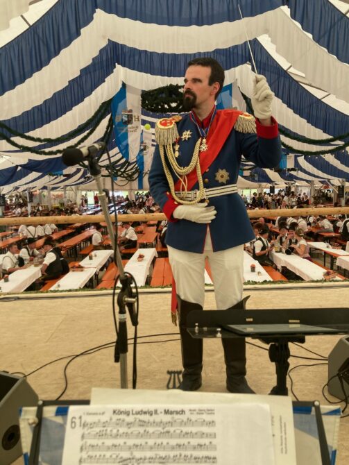 Seine schönste Rolle hatte er nicht nur aus seiner Sicht, sondern auch in den Augen der vielen Zuschauer am Festsonntag des Priener Trachtenvereins als er beim Festzug auf dem Festwagen Bayerns Märchenkönig Ludwig II. darstellte. Fein-ruhig im Benehmen und gekonnt in der Kleidung war er sofort als Seine Majestät zu erkennen, erst beim zweiten Blick wurde er als Darsteller Peter Thaurer erkannt. Im Festzelt angekommen war es für ihn und ganz besonders für die Festmusikkapelle Prien eine Ehre, dass der Ehrengast den „König-Ludwig-II“ dirigierte.