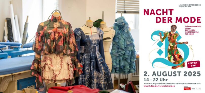 Am Samstag, 2. August 2025 wird das Haus der Bayerischen Geschichte bereits zum zweiten Mal Treffpunkt für alle Fans außergewöhnlicher Mode. Nach der erfolgreichen Veranstaltung im August 2023 laden wir wieder zu einer „Nacht der Mode“ und zu einer faszinierenden Reise durch die Welt von Stoffen, Schnitten und Visionen ein. In diesem Jahr setzen sich die Entwürfe in besonderer Weise mit der Ästhetik und Zeit von König Ludwig I. auseinander – innovativ, historisch reflektiert und überraschend modern. Inspiration bot den Schülerinnen und Schülern der Deutschen Meisterschule für Mode die Bayerische Landesausstellung „Ludwig I. – Bayerns größter König?“, die noch bis 9. November im Donausaal zu sehen ist.