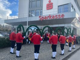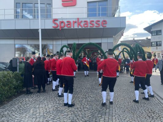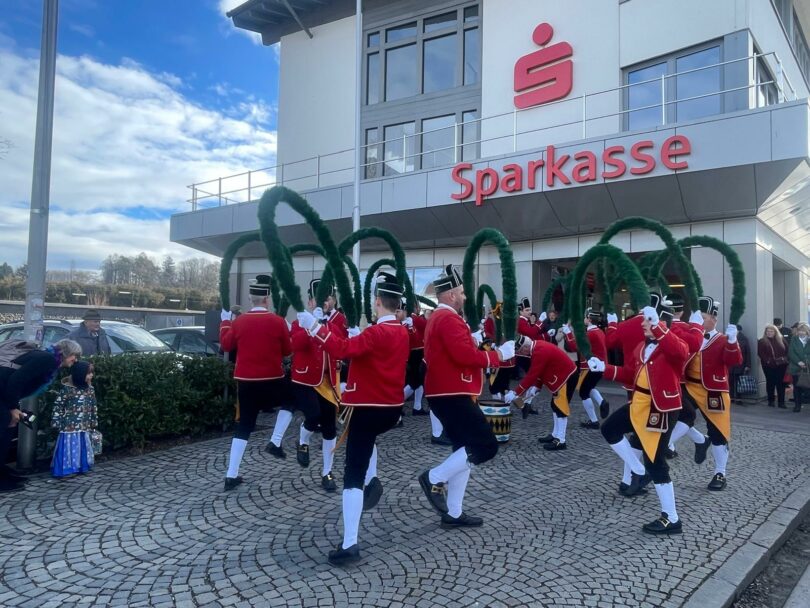 Fotos: Hötzelsperger – Kolbermoorer Schäffler vor der Sparkasse in Prien a. Chiemsee (weitere Informationen: www.immergruen-kolbermoor.de)