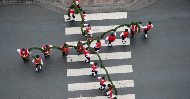 “Aba heid is koid” – ganz gemäß diesem Refrain trotzten die Schäfflertruppe vom Trachtenverein “Immergrün” Kolbermoor und die mit ihr traditionell mitreisenden Musikanten der Blaskapelle “Am Wasn” dem heftigem Schneetreiben als sie auf dem Priener Marktplatz ihren Auftritt zeigten. Alle sieben Jahre treten die Schäffler zur Erinnerung an das Ende der Pestzeit auf und einer der vielen Auftritte in der Faschingszeit erfolgte auf Einladung der Marktgemeinde in Prien. Trotz des Schneefalls folgten einige Priener dem etwa zwanzigminütigem Geschehen. Dritter Bürgermeister Alfred Schelhas bedankte sich abschließend und nach dem für ihn gemachten Reifenschwung bei Schäfflertanzmeister und Bürgermeister Peter Kloo von der Stadt Kolbermoor mit herzlichen Worten und mit Priener Schnaps. “In sieben Jahren wollen wir wieder kommen in das schöne Prien a. Chiemsee” – so die Kolbermoorer Schäffler bevor sie zu ihrem nächsten Auftritt weiterzogen. Für Prien gibt es heuer noch eine zweite Möglichkeit, einem traditionellen Schäfflertanz beizuwohnen – am Sonntag, 24. Februar kommen auf Einladung der Prien Marketing GmbH die Schäffler und Musikanten aus Kirchheim bei München nach Prien. Deren Auftritt beginn nach dem Sonntags-Gottesdienst um 11 Uhr. Die Kirchheimer fahren dann zu weiteren Auftritten weiter nach Herrenchiemsee (am Königsschloss) sowie nach Aschau i. Chiemgau (vor dem Rathaus) und zum Samerberg (Dorfplatz).