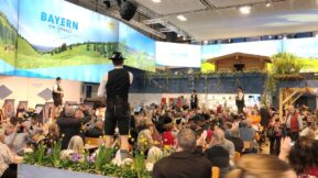 Wie dieser Bilderbogen zeigt, erfreuten die Dirndl und Buam samt Schnalzern nicht nur in der Bayernhalle, sondern auch im Europa-Center und vor dem Brandenburger Tor.