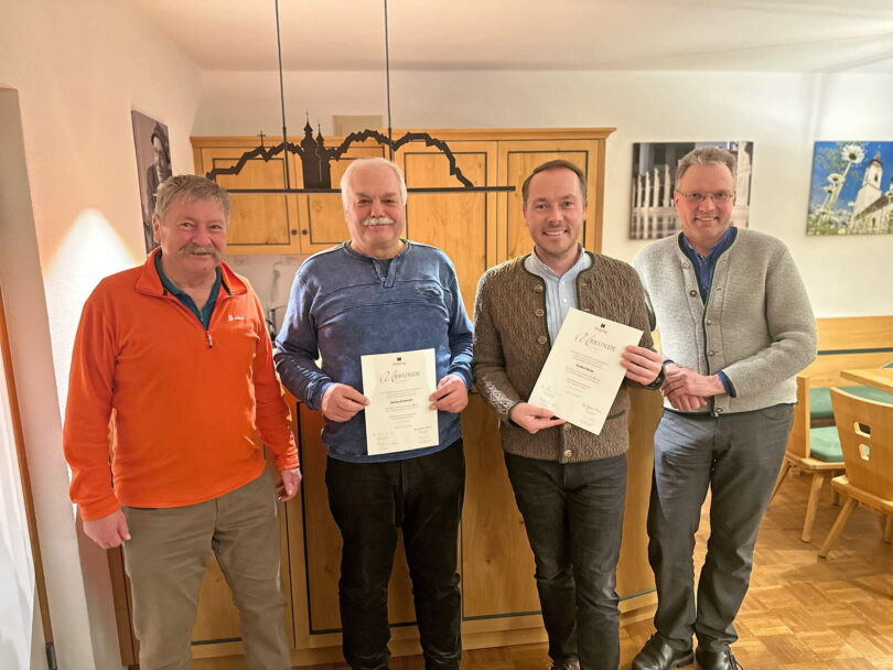 Zwei besondere Ehrungen konnten bei der diesjährigen Jahreshauptversammlung der Kolpingfamilie Aschau überreicht werden. Erster Vorstand Johann Berghammer (links) überreichte Gerhard Pellkofer (Zweiter von links) eine Urkunde für seine 40jährige Mitgliedschaft. Besonderer Dank galt Pellkofer, der zugleich auch seit 40 Jahren das Amt des 1. Kassiers bei der Kolpingfamilie innehat.