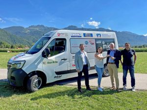 Zur offiziellen Schlüsselübergabe und ersten Probefahrt trafen sich Aschaus Zweiter Bürgermeister Michael Andrelang (zweiter v.r.), Vorstandschaftsmitglied des Gewerbevereins Christian Trattner (links) und der Energiebeauftragte der Gemeinde Aschau i.Chiemgau Stefan Arberger (rechts) zusammen mit Tina Krieger von der mikar GmbH.