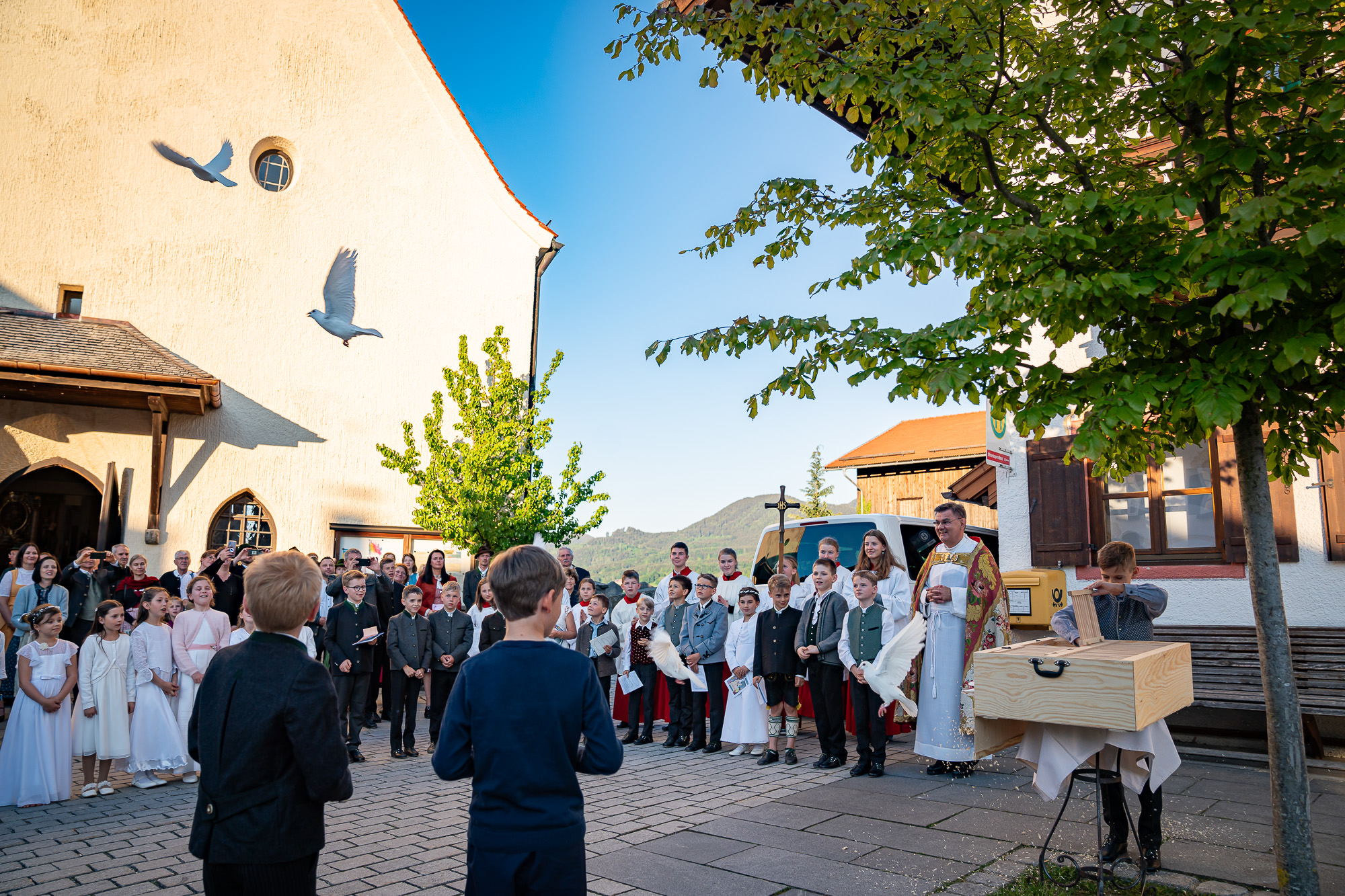 24 weiße Tauben stiegen für jedes Kommunions-Kind in den Himmel empor. Besonders Gedacht wurde mit dieser rührenden Geste an Veronika Daxelberger, die verstorbene Mutter vom Xaver Ascher, eines der Erstkommunionkinder.