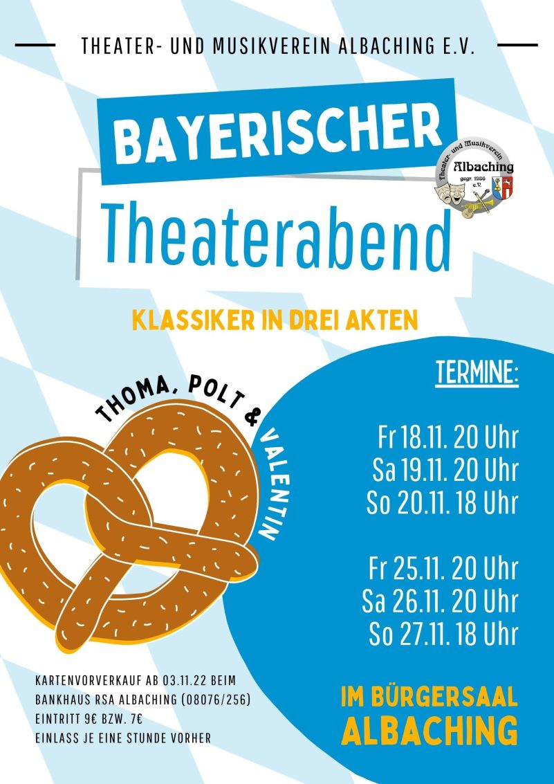 Mit einem Bayerischen Einakterabend warten die Albachinger Theaterleute diesen Herbst auf. Und dabei trifft sich die Crème de la Crème der bayerische Komödien-Szene an einem Abend auf der Bühne: Ludwig Thoma, Gerhard Polt und Karl Valentin. So unterschiedlich die Schaffenszeiten der drei Humoristen, so vielfältig ist auch das Humor-Repertoire, sodass für jeden Lach-Geschmack etwas ist.