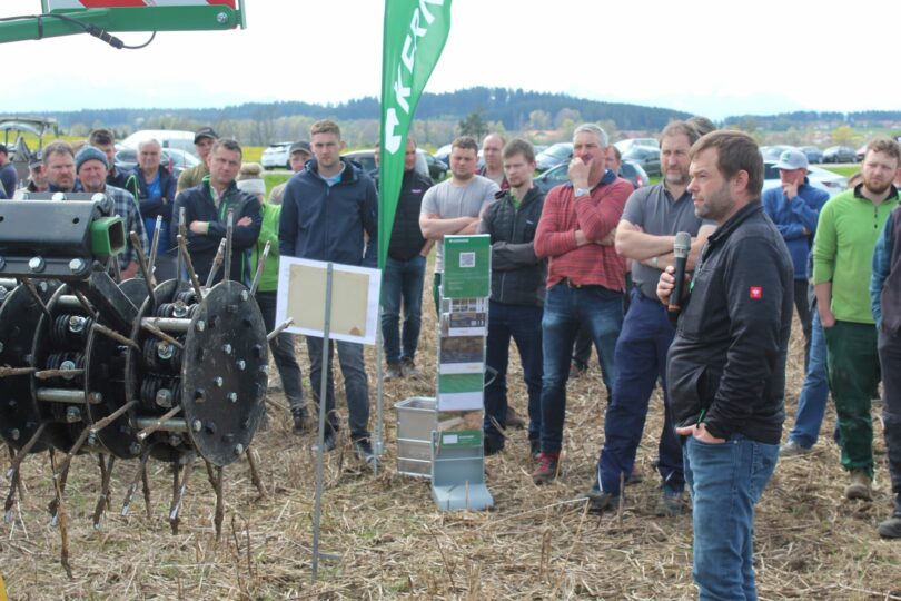 Wie kann ein Durchwuchs von Zwischenfrüchten ohne Pflug verhindert werden?“ – diese Frage stellen sich viele Landwirtinnen und Landwirte seit Inkrafttreten der neuen bayerischen Erosionsschutzverordnung. Der geforderte Zwischenfruchtanbau und die gleichzeitigen Einschränkungen zu Saatzeitpunkt und Bodenbearbeitung im Frühjahr stellen für die Landwirtschaft eine große Herausforderung dar. Darin sind sich Praktiker einig. Bei einer zweitägigen Praxisvorführung Mitte April in Traunwalchen und Leustetten wurden deshalb auf zwei Demonstrationsbetrieben verschiedene Alternativen zum Pflug vorgestellt, die eine konservierende Bodenbearbeitung ermöglichen und die Vorgaben der bayerischen Erosionsschutzverordnung einhalten.