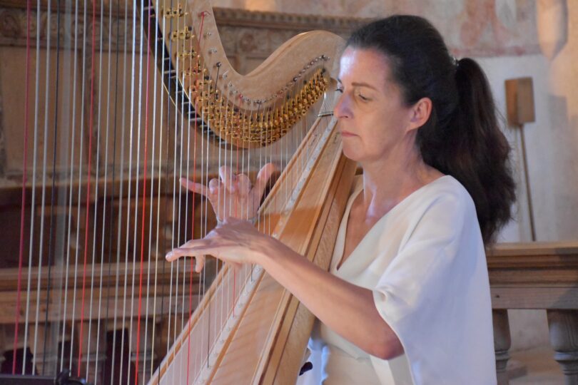 Schon bei dem ersten Stück von dem belgischen Komponisten Hasselmans „La Source“ (die Quelle), konnten sich die Zuhörer bei den ersten Tönen der Harfe mit geschlossenen Augen gut vorstellen, wie es im Wald zu einer munter sprudelnden Quelle geht, was bei den tropischen Temperaturen im Sommer sehr angenehm ist. Der erste Beweis, wie passend ein Harfenspiel im Sommer sein kann, viele weitere Beispiele folgten.