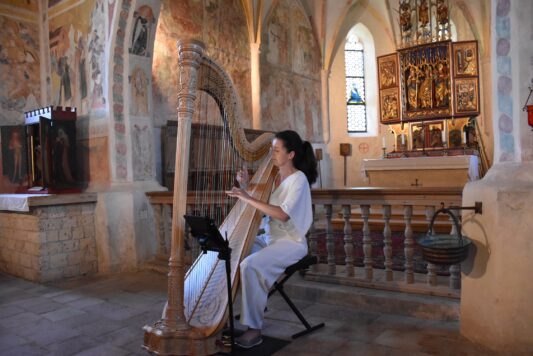 Silke Aichhorn erzählte den Zuhörern, dass es für sie ein großes Privileg ist, an diesem besonderen Ort auf ihrer Harfe zu spielen. Ein kleiner humorvoller Exkurs zu dem Instrument folgte. So ist es nicht so einfach mit einem der größten und schwersten Instrumente den Berg hinauf zu kommen. 40 Kilogramm wollen bewegt werden. Jedes Kilogramm kostet eintausend Euro, kommt aus Amerika und hält nur sechs bis acht Jahre. Die Harfe muss mit Händen und Füßen bedient werden, die Spielerin muss also multitaskingfähig sein, darum sind es meist Frauen, die das Instrument spielen, erzählt die Künstlerin augenzwinkernd.
