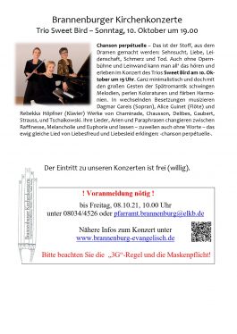 Im Rahmen der „Brannenburger Kirchenkonzerte“ spielt am Sonntag 10. Oktober, um 19.00 das Trio Sweet Bird das Werk „Chanson perpétuelle“.