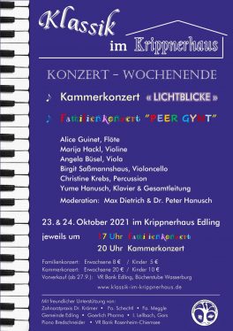 Im Rahmen von „Klassik im Krippnerhaus“ in Edling bei Wasserburg gibt es am 23. und 24. Oktober um 17 Uhr das Familienkonzert „Peer Gynt“ von Edvard Grieg zu hören – eine Geschichte mit Musik und Bildern für Kinder zwischen 5 und 12. Um 20 Uhr an den beiden Tagen findet zudem das Kammerkonzert „Lichtblicke“ statt.