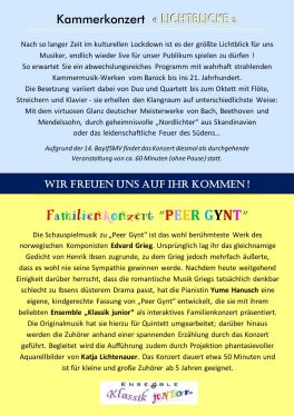Die in der Region bekannten Kinderkonzerte für Schulen von „Klassik Junior“ konnten 2020 und 2021 nicht stattfinden. Zu hören sind sie dieses Jahr nur zwei Mal – große Musik für kleine Ohren! Das Kammerkonzert mit dem selben Ensemble unter Leitung von Yume Hanusch bringt ein abwechslungsreiches Programm glanzvoller „klassischer“ Stücke – Lichtblicke nach langer Zeit!