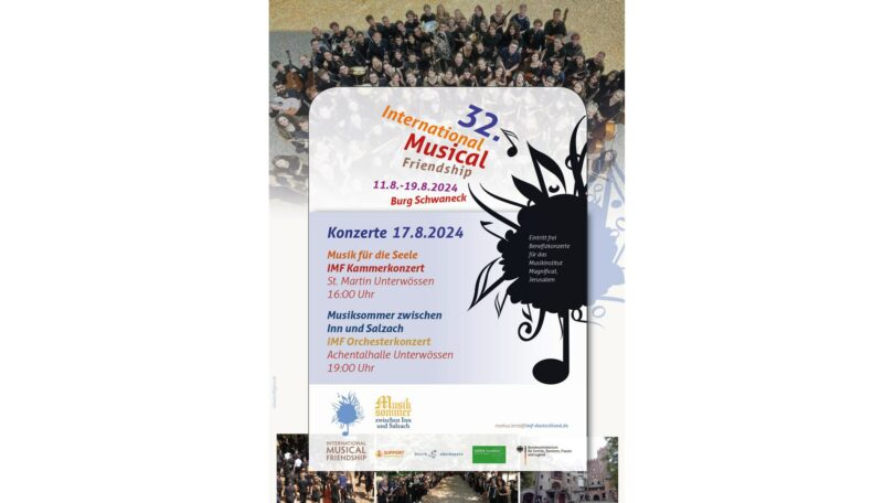Am kommenden Samstag, 17. August 2024, finden im Rahmen der 32. International Musical Friendship zwei Konzerte in Unterwössen statt. Um 16:00 Uhr beginnt das Kammerkonzert „Musik für die Seele“ in der St. Martin Kirche. Um 19:00 Uhr folgt das Orchesterkonzert „Musiksommer zwischen Inn und Salzach“ in der Achentahalle. Der Eintritt zu den Benefizkonzerten ist frei, Spenden kommen dem Musikinstitut Magnificat in Jerusalem zugute.
