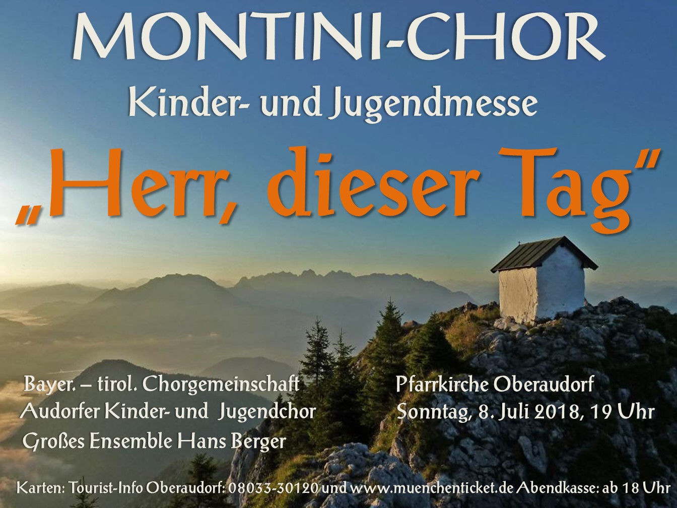 Mit dem Konzert beschreitet Hans Berger neue, generationsübergreifende Wege. Neben seinem MONTINI-Chor musizieren der Audorfer Kinder- und Jugendchor unter der Leitung von Birgit Sporer, die Bayerisch-tirolerische Chorgemeinschaft sowie das Große Ensemble Hans Berger. Da Teile des Konzertprogrammes bereits im Rahmen der feierlichen Erstkommunionen in Oberaudorf und Reisach erklangen, werden sogar die Erstkommunikanten dieses Jahres mitwirken.