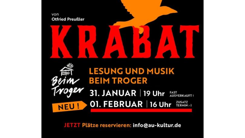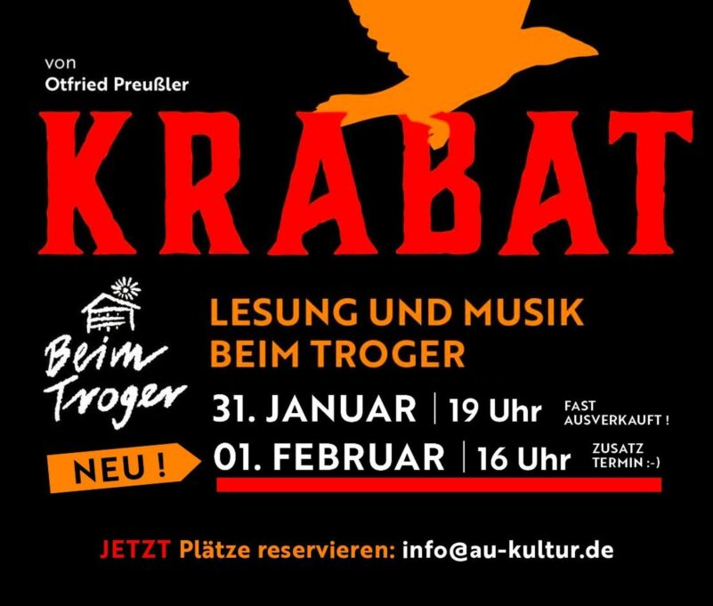 Und dieser wird seit nun schon fast drei Jahren, als dieser faszinierende Ort erst zum Vorschein kam, von den Auer Ortsvereinen neu zum Leben erweckt. Was meint ihr? Hat der Troger seine Finger mit im Spiel? Schafft Krabat mithilfe seiner Liebe zur Kantorka sich vom Meister zu befreien? Wer es erfahren will, kommt am 1. Februar in die Ortsmitte von Au und wir sehen gemeinsam, wer gewinnt. Beginn ist um 16:00 Uhr. Für Speis und Trank ist bestens gesorgt.