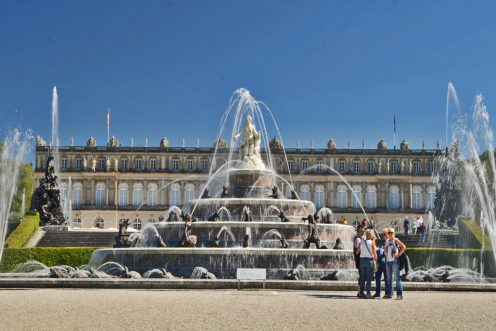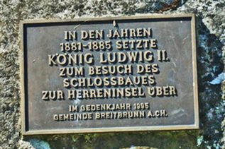 Nun spazieren wir durch eine Lindenallee und eine kunstvoll angelegte Parkanlage mit Springbrunnen, deren Fontänen alle 20 Minuten emporschießen, auf die Gartenfassade des Prunkschlosses zu, das der Bayernkönig Ludwig II. vor etwa 150Jahren errichten ließ. Die Führung durch das Schloss dauert etwa 30 Minuten. Im König-Ludwig-II-Museum erfährt man noch mehr zur Person des unglücklichen Herrschers und in der Fledermaus-Ausstellung kann man Interessantes über die nächtlichen Segler erfahren, die als Untermieter im Schloss wohnen. Nach dem Latonabrunnen beginnt ein schattiger Spaziergang, der uns in etwa 20 Minuten zum Dampfersteg zurück bringt.