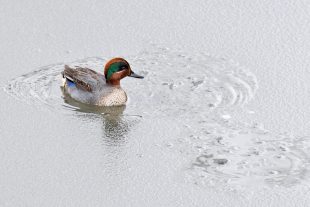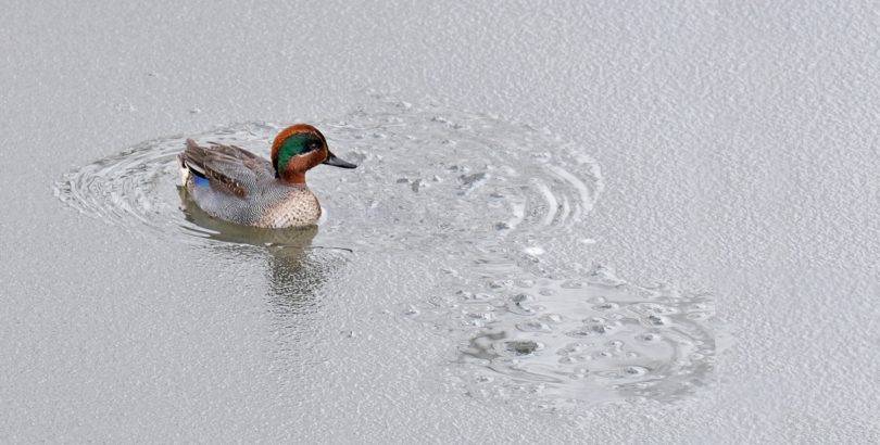 Je kälter es wird, desto mehr scheinen sich die Wasservögel am Greamandlweiher zwischen Prien und Rimsting auszutoben. Die Krickenten haben sich, ähnlich Eisbrechern, durch das vereiste Wasser einen Weg gebahnt. Das Wetter mag trüb sein, ihr Gefieder ist es nicht. Auch die Wasserralle zeigte sich, allerdings in etwas größerer Entfernung.