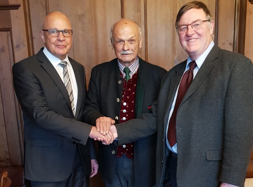 Amtsübergabe des ehrenamtlichen Schulreferenten. Der neue Schulreferent Frank Thieser, Schulamtsdirektor a.D. – Heinrich Rehberg, Bezirksvorsitzender Oberbayern des Volksbundes Deutsche Kriegsgräberfürsorge – der bisherige Schulreferent Stephan Wiesheu, Rektor a.D. (von links)