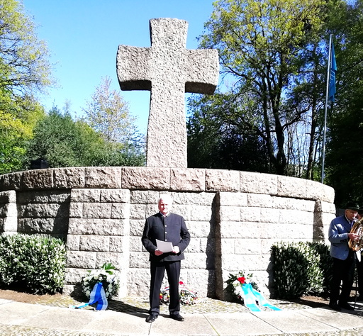 Die Blaskapelle Niklasreuth und zehn Fahnenabordnungen aus den Vereinen der IG Rosenheim gaben der Gedenkstunde eine ganz besondere Note. Pfarrer Michael Nagel zelebrierte einen Wortgottesdienst für alle Kriegsopfer. Obmann Pius Graf mahnte: „Wenn die Generation der Kriegsteilnehmer und aller die unmittelbar betroffen waren in den nächsten Jahren abtritt, dann ist es die Aufgabe unseres Verbandes das Gedenken zu bewahren“. Zu den Klängen des Liedes vom Guten Kameraden und der beiden Nationalhymnen legten Botschafterin Dr. Heike Peitsch, Bürgermeisterin Jaqueline Breuer, der Ehrenvorsitzende des Volksbundes Bezirk Oberbayern Heinrich Rehberg sowie Obmann Pius Graf einen Kranz am Hochkreuz der Gedenkstätte nieder.