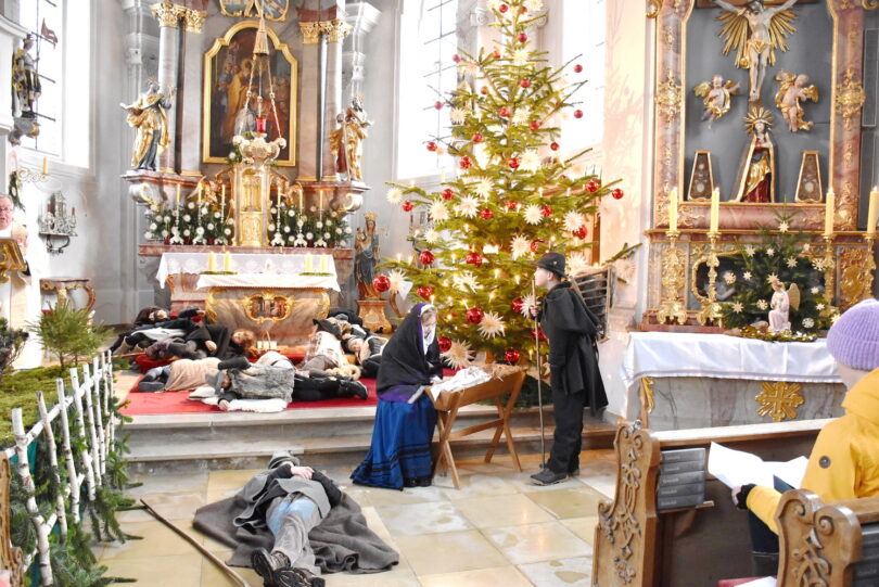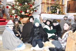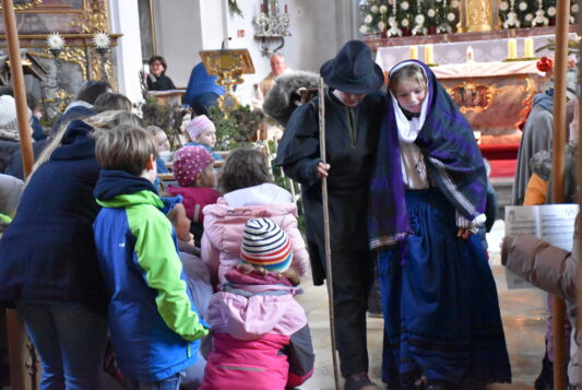 Das Krippenspiel begann mit Maria und Josef, die in Kirche kamen und um Unterkunft baten und barsch abgewiesen wurden. Dann traten die Hirten auf, die in Bethlehem auf das helle Licht des Sternes am Himmel schauten. Sie schliefen bald ein und erwachten als Maria und Josef im Stall standen und das Jesuskind in der Krippe lag. Begleitet wurde das Spiel vom Gesang des Kirchenchores und der Kinder mit Maria Blank an der Orgel. Sehr stimmungsvoll sangen alle Kirchenbesucher zum Schluss der Messe das Lied „Stille Nach, heilige Nacht“. Peter Bergmaier bedankte sich bei allen, die zu diesem besonderen Gottesdienst beigetragen haben, besonders auch bei Gabi Speiser, die das Krippenspiel mit den Kindern eingeübt hatte. wun