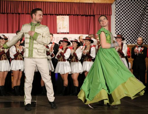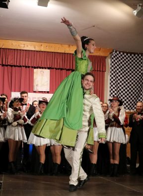 Der Saal der Bernauer Kampenwand war nach dem Motto „Aschau startet die Motoren – mit Vollgas durch den Fasching“ phantasievoll mit hochklassigen Autos dekoriert und beim 45. Inthronisationsball der Aschauer Faschingsgilde trotz der widrigen Witterung einigermaßen gut besucht. Alle Ballbesucher erlebten auf der Bühne ein optisch perfekt aufeinander abgestimmtes Prinzenpaar – die Prinzessin in einem gelbgrün-elfenbeinfarbigen Brokat-Prinzesskleid-Traum – geschneidert von Elisabeth Schelzke – und der Prinz dazu abgestimmt in einer silbernen Barock-Brokatlivree mit grün-goldener Verschnürung, dazu trug er eine lange helle Hose mit breiten Biesen und Paspelierung. Sie zeigten gemeinsam einen wunderschönen, gefühlvollen Prinzenwalzer nach Motiven von Strauss und später einen temperamentvollen Showtanz.