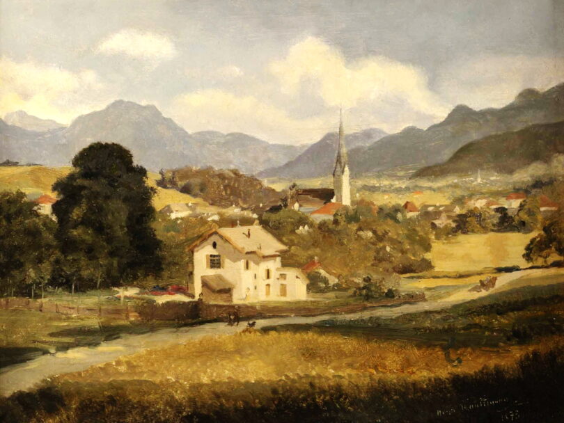 Bericht: Markt Prien a. Chiemsee / Foto: Kunstsammlung des Marktes Prien a. Chiemsee – Hugo Kauffmann, Landschaft Prien, 1873, Öl/Holz. Die Jagd, das bäuerliche Leben sowie die holländischen Meister des 17. Jahrhunderts begeisterten Anton Burger und Hugo Kauffmann gleichermaßen.