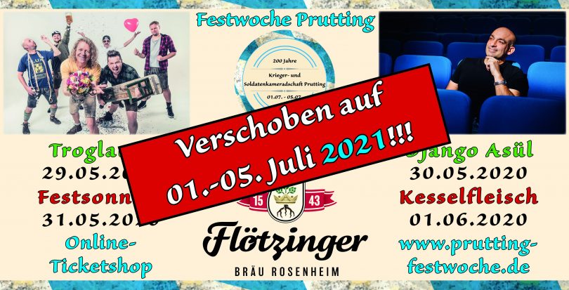 Ein wichtiger Hinweis zu den bereits verkauften Karten für die Troglauer und Django Asül. Diese behalten auch für den neuen Termin ihre Gültigkeit. Für den neuen Termin können bereits jetzt schon Tickets in den Vorverkaufsstellen und im Onlineshop erworben werden. Infos findet man hierzu unter www.prutting-festwoche.de.