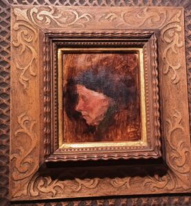 Kleines Porträt von Sepp Hilz mit handgearbeitetem Holzrahmen gibt es für 200 Euro im Nachverkauf.