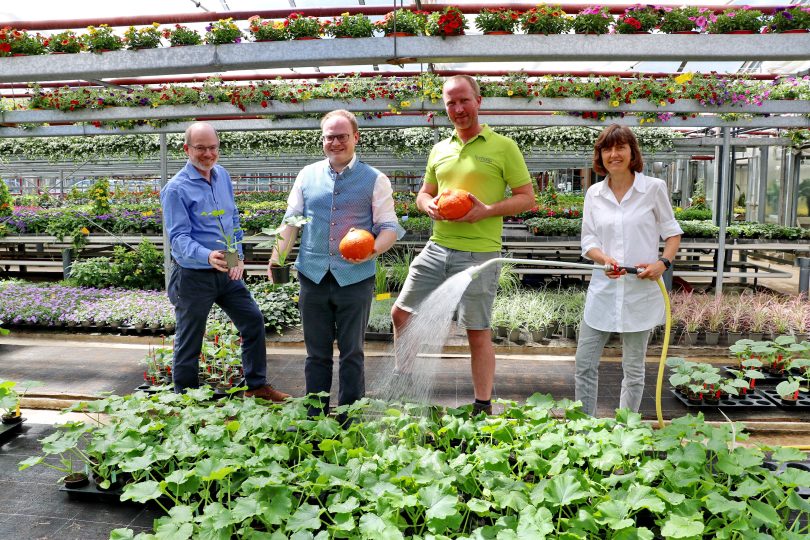 Foto: Prien Marketing GmbH: (v.l.n.r.) In enger Zusammenarbeit mit der Gärtnerei Rother startet die PriMa zum zweiten Mal den Kürbiswettbewerb „Prien pflanzt – Prien erntet“. Vorab wurden die allesamt kräftig gewachsenen Kürbissetzlinge von dem Zweiten Bürgermeister Michael Anner, dem Ersten Bürgermeister der Marktgemeinde Andreas Friedrich, dem Inhaber von Rother’s Blumen-Paradies e.K. Philipp Rother und der Geschäftsführerin der Prien Marketing GmbH Andrea Hübner in Augenschein genommen. Schon heute kann man gespannt sein, welche der über 150 Jungpflanzen das Rennen macht und in den kommenden Monaten die größte Kürbisfrucht hervorbringt.