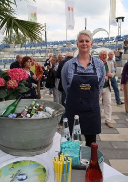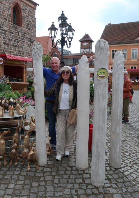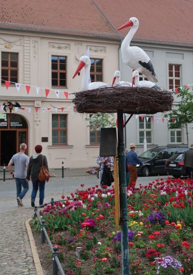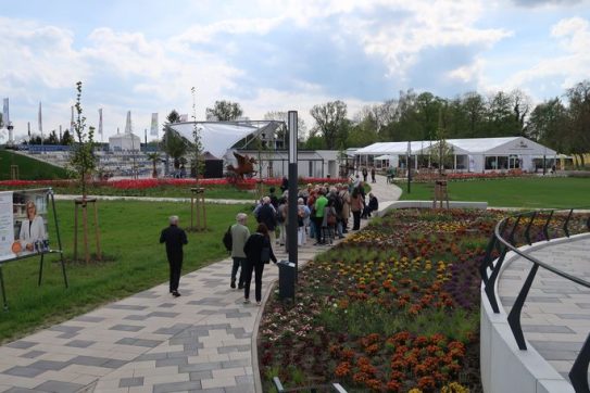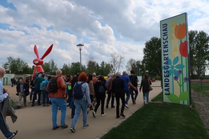 Erster Anlaufpunkt der Medienexkursion war die Landesgartenschau in Beelitz. Die beiden Geschäftsführer der Gartenschau, Marina Ringel und Bernhard Knuth, Beelitzer Bürgermeister, empfingen die Gäste vor einem farbenprächtigen Blumenbeet am Eingang. Sie gaben einen Überblick über das, was dem Besucher auf der Gartenschau erwartet. Es ist ein „Gartenfest für alle Sinne“, so der Bürgermeister. Neben den gärtnerischen Themenbereichen, wie farbenprächtige Blumenbeete, Feuchtbiotope, Staudenanlagen, Mustergärten, Andachtsgarten, Blumenhallenschau, etc. wird auf der Freilichtbühne auch viel Kultur geboten. Daneben bietet die Spargelstadt Beelitz auch vielerlei künstlerische und kulinarische Genüsse. Denn das Leitmotiv der Landesgartenschau Beelitz ist die Kulinarik. So ist auch vieles rund, den Tellern ähnlich, gestaltet, erklärte Frau Ringel. Insbesondere faszinieren die runden Blumenbeete den Besucher.
