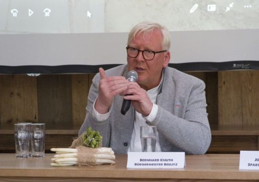 Hinsichtlich nachhaltiger Gastronomie, Gastlichkeit und touristische Naturziele in der Region Beelitz nahm Herr Knuth Stellung. Die “Spargelstadt Beelitz” steht wie kaum ein anderer Ort für hochwertige regionale Produkte. So ist auch die Kulinarik eines der Hauptthemen auf der Landesgartenschau Beelitz. Mit dem Spargelhof Kleistow haben wir für die Gastronomie einen Partner aus der Region gewonnen, der einerseits reichlich Erfahrung beim Anbau und der Weiterverarbeitung hochwertiger landwirtschaftlicher Erzeugnisse hat, andererseits aber auch in Gastronomie kompetent ist. In vielerlei Beziehungen ist unsere Landesgartenschau einzigartig, so Herr Knuth. So ist z. Bsp. die Kirchengemeinde mit einem Andachtspavillon aktiv in das Gartenschauprogramm eingebunden. Ein großer Spielplatz auf dem LaGa-Gelände, eine Märchenlandschaft am Feuchtbiotop und in der Streuobstwiese inklusive Lesebühne zeichnet Beelitz als familienfreundliche Stadt aus. Ein Regionalmarkt rund um die Kirche, in der historische Altstadt von Beelitz, ermöglicht den Bürgern und Besuchern regionale Produkte zu erwerben. All dies und vieles mehr zeichnet die „Zukunftsregion Beelitz“ aus.