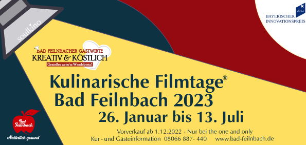 2012 mit dem Bayerischen Innovationspreis ausgezeichnet, geht das beliebte Feilnbacher Filmfestival von und mit den Kreativ & Köstlich Wirtinnen und Wirten ins Jahr 2023. Eine Filmtour durch ganz besondere Gasthäuser, mit filmischen Schmankerln, abgeschmeckt mit Stargästen, Verlosungen, Filmgesprächen – abgerundet durch ein feines Menü: kreativ und köstlich eben.