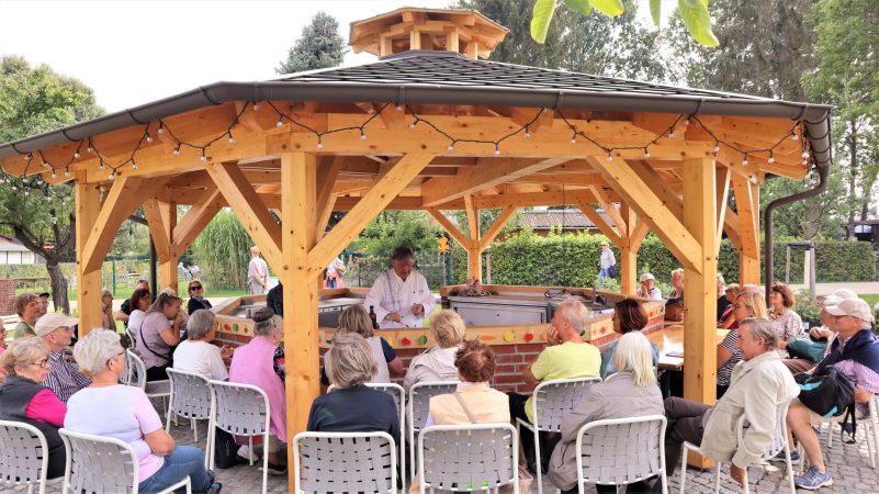 Die Zuschauerin an der Sommerküche der Landesgartenschau ist begeistert, als Georg Bartsch sein Rezept erklärt: „Sehr gut, dafür habe ich ja alle Zutaten in meinem Garten.“ Der Wiesenburger Hobbykoch kredenzt an diesem Septembernachmittag Kartoffelpuffer mit Bärlauch-Dipp. „Die hat meine Mutter schon für meinen Vater und mich gemacht, ich habe das Rezept dann noch etwas verfeinert“, sagt Bartsch den knapp 30 interessierten Gästen. Dass neben Möhren, Zwiebeln und natürlich Kartoffeln auch Zucchini und Knoblauch in seine Puffer kommen, überrascht die Gäste, die wie immer in der LAGA-Sommerküche am Ende kosten können, was vor ihren Augen entstanden ist.
