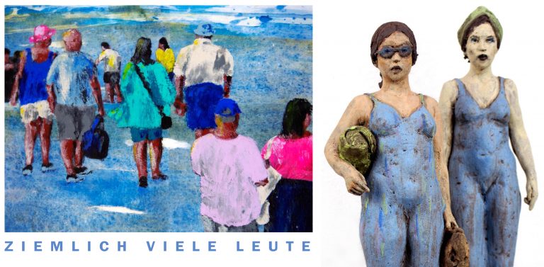 Ulrike Kirchner präsentiert ihre „Leute“ auf vielschichtigen Collagen aus Malerei, Zeichnung, Fotografie und Wachs: Menschen beim Einkaufsbummel, beim Strandspaziergang oder gemütlich im Café sitzend.