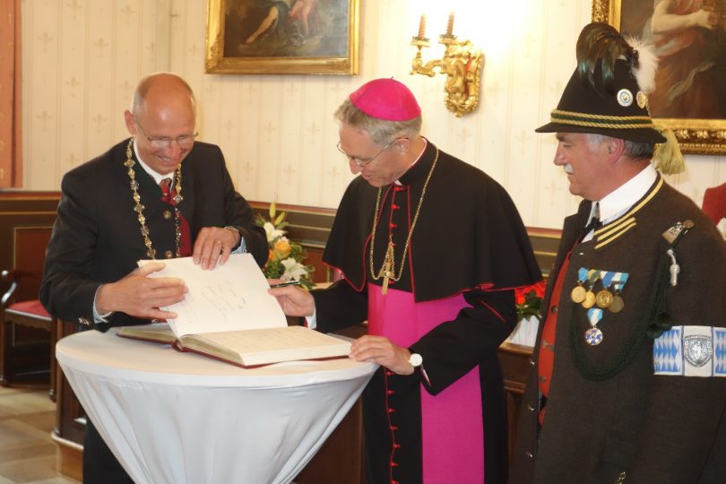 Hohen Besuch hatte die Stadt Traunstein aus Rom. Im Rahmen der Verleihung der Ehrenmitgliedschaft durch die Gebirgsschützenkompanie Traunstein an Kurien-Erzbischof Dr. Georg Gänswein trug sich der hohe Geistliche und Privatsekretär von Papst emer. Benedikt XVI in das Goldene Buch der Stadt Traunstein ein. Im Trauungszimmer des Rathauses freute sich Oberbürgermeister Christian Kegel, den Erzbischof sowie die Vertreter der Gebirgsschützen begrüßen zu dürfen und diese ins Goldene Buch eintragen zu lassen – davon einige Bilder.