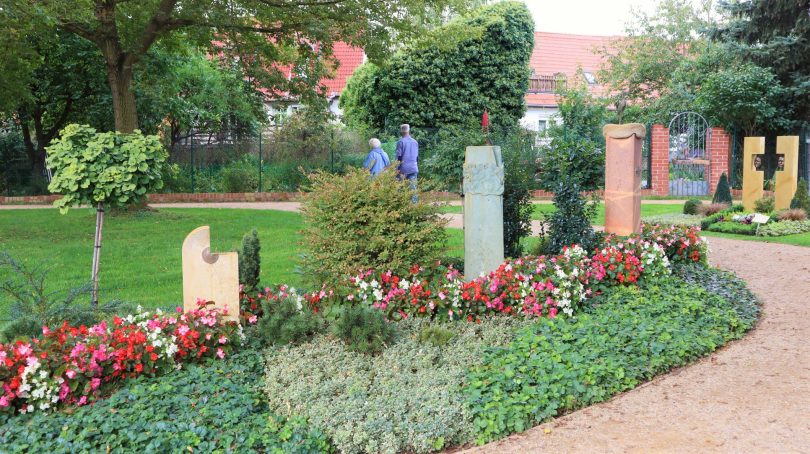 Beispiele für moderne Friedhofskultur finden sich auch im Andachtsgarten der Landesgartenschau. Steinmetze und Friedhofsgärtner haben hier gemeinsam neun Mustergräber angelegt, die zeigen, wie moderne Pflanzen mit wenig Pflegeaufwand und individuelle Grabmale kombiniert werden können. Als Beispiel der Vielfalt moderner Bestattungsformen ist ein Feld mit drei Gräbern angelegt, die durch geschwungene Linien miteinander verbunden sind. In einer solchen Anlage können sowohl Sarg- als auch Urnenbestattungen durchgeführt werden, die parkähnlich gestaltete Fläche wird dann von Friedhofsgärtnern gepflegt. Eine solche Anlage bietet derzeit etwa der Neue Friedhof in Potsdam.