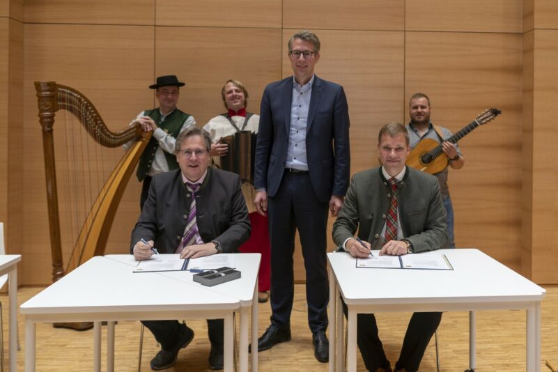Die Vertragsunterzeichnung wurde in der Bavariathek des Hauses der Bayerischen Geschichte in Regensburg bunt und musikalisch begleitet. Roland Pongratz, Musikalischer Leiter der in Freyung ansässigen „Volksmusikakademie in Bayern“, kam mit einem flugs zusammengestellten Trio, dem die bayernweit beliebten Musikkabarettisten und Volkssänger „Tom & Basti“ angehörten. Der musikalische Auftakt für die Bayerische Landesausstellung 2026 ergab somit in Bild und Ton einen Vorgeschmack auf die thematische Bandbreite und Vielfalt der ersten Bayerischen Landesausstellung zum Thema Musik – sozusagen von Orlando di Lasso über die Carmina Burana, Defiliermarsch und Schützenlisl, über Roy Black bis zu LaBrassBanda.