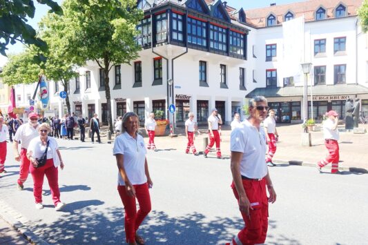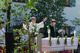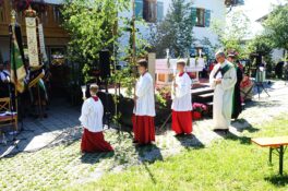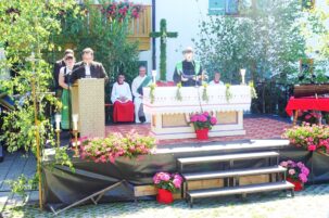 Den Jungbauernschaft-Gottesdienst feierten Pfarrer Mirko Hoppe von der Evangelischen Christuskirche und Diakon Michael Leberle von der Katholischen Pfarrgemeinde „Mariä Himmelfahrt“ in Ökumenischer Verbundenheit. Die musikalische Gestaltung übernahmen die Festmusikkapelle Prien unter der Leitung von Regina Huber sowie mit Gesang und Gitarrenbegleitung Maria Plank aus Breitbrunn und Andreas Waldherr aus Siegsdorf aus den Reihen der Jungbauernschaften. „30 Jahre Jungbauernschaft in Prien und Umgebung sind gleichzusetzen mit Zusammenhalt, Gottvertrauen und Herzblut, deshalb lasst uns in Zeiten der kirchlichen Trennung das Fest gemeinsam und mit Sonne im Herzen feiern“ – so Mirko Hoppe zu Beginn und er bat die versammelte Jungbauernschaft, die ihnen vom Herrgott anvertraute Landwirtschaft und Landschaft mit Demut vor Gott zu erhalten. Diakon Leberle ging in seiner Predigt auf das Evangelium vom Sämann ein und sagte: „Jeder von uns ist ein Sämann wie Jesus einer war, in uns allen liegt der Samen Gottes in Form von Glaube, Hoffnung und Liebe“. Und Leberle fügte hinzu: „Was wir bei den Priener Festwochen bei Euch und bei den Trachtlern gesehen haben, habt Ihr die Talente der anpackenden Tatkraft, der Musik, der Weisheit („Was dient dem Leben und was ist schädlich?“) und des Gebetes“. Als selbst langjährig Aktiver in der Katholischen Landjugend beendete der Diakon seine Ausführungen mit dem Wunsch, dass auch in den nächsten 30 Jahren bei der Jungbauernschaft Prien und Umgebung Werte und Solidarität gelebt werden und dass mit Wertschätzung gegenüber der wunderbaren Natur stets ein fruchtbarer Boden zu finden sei. Im Rahmen des Gottesdienstes pflanzten Mitglieder der JB-Vorstandschaft Getreide, einen Olivenbaum und eine Hortensie um den Blick auf die Schönheit der Chiemgauer Landschaft zu schärfen. Die Kollekte beim Gottesdienst kommt dem Behandlungszentrum und der Kinderklinik von Aschau i. Chiemgau zugute. Den Abschluss bildete die gemeinsam gesungene Bayernhymne.