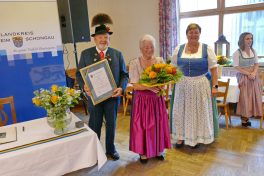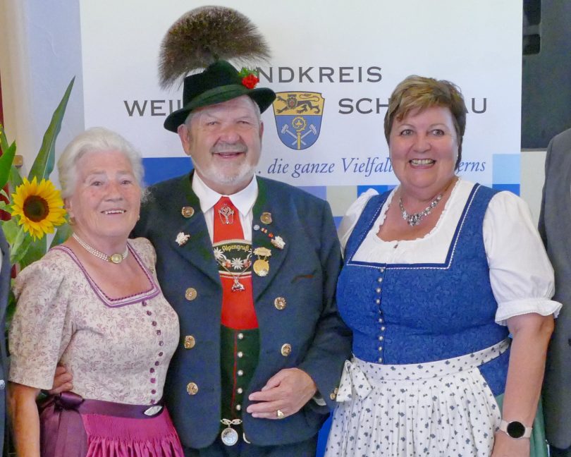 Einer, der sich schon sehr, sehr lange in diesem Landkreis mit großem Einsatz engagiert, wird heute bei der Gelegenheit geehrt. Und zwar – ziemlich alle dürften ihn kennen: Max Bertl. Der Termin wurde wegen der Corona-Pandemie bereits mehrfach geschoben, heute findet er endlich statt. Auf den Feldern Regionalpolitik und der Brauchtumspflege hast Du, lieber Max, die Messlatte die Messlatte ziemlich hoch gehängt. Ohne immer zu fragen: Was bekomme ich dafür? So definiert sich Ehrenamt: Sich unentgeltlich für die Gemeinschaft einsetzen. Ein herzliches „Vergelt’s Gott“ dafür schon mal vorweg! Du bist einer, der anpackt. Als Zimmerermeister in Wildsteig hast du gute Arbeit geleistet, viele Dachstühle aufgestellt und schöne Holzhäuser erbaut. Vermutlich sind die ersten Lehrlinge, die du in deinem Betrieb ausgebildet hast, selbst schon lange Lehrherren, und vermitteln dein wertvolles Wissen weiter an ihre Azubis. Unter dem Motto „Das Feuer weitergeben, und nicht die Asche“ hast du stets das Thema Tradition und Moderne ideal in der goldenen Mitte angepackt. Man muss das Rad nicht immer neu erfinden: Es gibt einiges in unserer bayerischen Kultur zu erhalten – du hast nicht lange geredet, sondern es einfach gemacht. Gerade mal mit 18 Jahren, also 1964, bist du dem Trachtenverein Alpengruß in Wildsteig beigetreten. Bis heute hältst du diesem Deinem Heimatverein die Treue. Doch du wolltest immer mitgestalten, nicht nur dabei sein. Daher hast du dich über die reine Mitgliedschaft hinaus intensiv engagiert: Erst als Mitglied im Vereinsausschuss, ab 1984 als zweiter Vorstand und ab 1986 als erster Vorstand. Nebenbei hast du im Gauvorstand Oberer Lechgau mitgemischt. Bis man überregional auf Dein Talent und Deine Begeisterung aufmerksam wurde: Ab 2002 hast du als zweiter Landesvorsitzender des Bayerischen Trachtenverbands die Geschicke aller bayerischen Trachtler mitgelenkt, ab 2011 als erster Landesvorsitzender: Das hast du bis 2021 gemacht. Und nun deinen Vorsitz abgegeben, damit die Jungen auch mal ran können. Auch das muss man können: loslassen. Dafür meinen Respekt, damit tun sich viele Macher schwer.