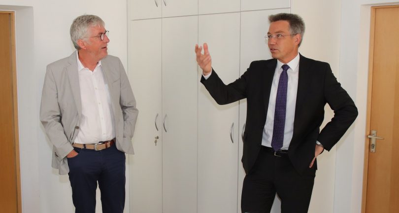Bildunterschrift: Schulamtsleiter Edgar Müller und Landrat Otto Lederer beim Rundgang im Schulamt.