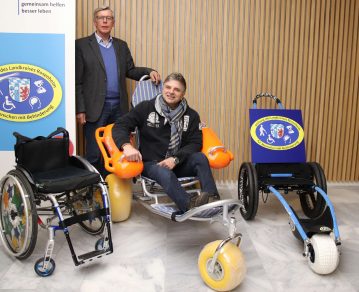 Foto 2: Hans Kerschbaumer (stehend) mit Sepp Höck von der Stiftung mit Menschen mit Behinderung und ihren Rollliegen, die in diesem Sommer an den Badeseen in der Region zum Einsatz kommen sollen