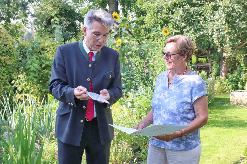 Damit ein Garten sich Naturgarten nennen darf, müssen eine ganze Reihe von Kriterien erfüllt ein. Bei Franziska Kröll ist das der Fall. Deshalb nahm sich Landrat Otto Lederer die Zeit, in das idyllisch gelegene Oberwertach zu fahren, einem Ortsteil von Feldkirchen-Westerham, um ihr Urkunde und Plakette zu überreichen.