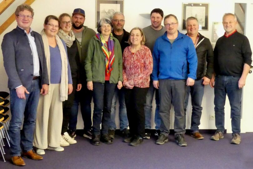 Foto: Margit Böhm  – Text: LRA Rosenheim – Bei einer Feierstunde wurden den Landwirten für ihr Engagement für den Kiebitzschutz gedankt (von links nach rechts): Bürgermeister Josef Niedermeier, Susanne Rahm, Veronika Hölzl, Georg Bräu, Carola Kahles, Josef Kain, Margit Böhm, Thomas Elmauer-Bierwirth, Gerhard Pröbstl, Thomas Thurnhuber, Günter Prietz. Auf dem Bild fehlen Josef Obermayr und Mathias Pledl.