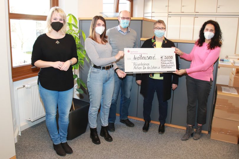 Beeindruckende 3.000 Euro haben die Schülerinnen und Schüler der Berufsschule II in Rosenheim an die Rosenheimer Aktion für das Leben gespendet. Das Geld wurde bei der traditionellen Weihnachtstombola erlöst. Schülermitverantwortung, Schulleitung und Verbindungslehrerinnen hatten die Aktion „Schüler helfen in der Weihnachtszeit“ mit großem Engagement und unter schwierigen Bedingungen organisiert. Zudem unterstützten zahlreiche Ausbildungsbetriebe mit Sach- und Geldspenden. Die Vorsitzende der Rosenheimer Aktion Christine Domek-Rußwurm lobte das großartige Engagement und freute sich, dass es trotz Corona-Auflagen gelang, die Weihnachtstombola durchzuführen. Mit dem Erlös wird die Aktion ein Coaching-Angebot zu gewaltfreier Kommunikation in Familien mitfinanzieren. Bei der Scheckübergabe mit dabei waren (von links) Verbindungslehrerin Franziska Arnold, Schülersprecherin Shivon Carrick, stellvertretender Schulleiter Christian Melchner, Schulleiterin Christiane Elgass und die Vorsitzende der Rosenheimer Aktion Christine Domek-Rußwurm.