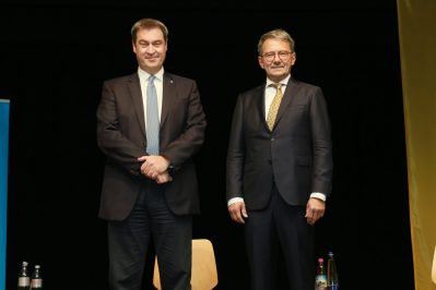 Foto: Bayerischer Landkreistag – Der Bayerische Ministerpräsident Dr. Markus Söder (links) gratulierte als einer der Ersten dem neu gewählten Präsidenten des Bayerischen Landkreistags, Landrat Thomas Karmasin, Fürstenfeldbruck.