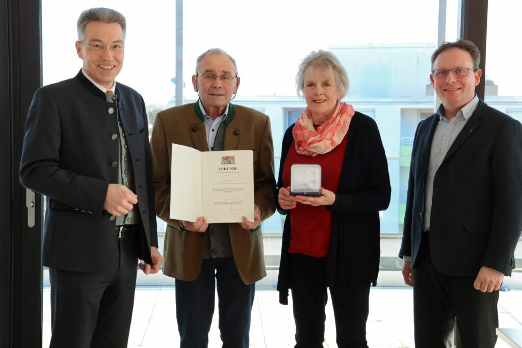 Die dritte Verdienstmedaille überreichte der Landrat Konrad Neumayr aus Frasdorf. Er war 32 Jahre Vorstand des Wasserbeschaffungsverbandes in Frasdorf. Sein Engagement für frisches Trinkwasser in der Gemeinde reicht aber noch viele weitere Jahre zurück. „Sie haben so viele ehrenamtliche Stunden für Frasdorf investiert – 24 Stunden waren Sie jeden Tag erreichbar, selbstverständlich und ohne Zögern“, führte Landrat Otto Lederer aus. „Viele halten dieses Engagement für selbstverständlich. Das ist es aber nicht. Was selbstverständlich ist, ist unser Dank dafür.“ Konrad Neumayr hat als Verbandsvorsitzender wichtige Weichen gestellt und den Verband sowie die Mitglieder gelenkt. In seiner Amtszeit wurden diverse Hochbehälter gebaut und eine UV-Anlage zur Wasseraufbereitung installiert. Konrad Neumayr hat den Verband in Frasdorf zu einem gut aufgestellten und professionellen Wasserversorger gemacht und dabei immer „Umsicht, Ruhe und auch den gebotenen Ernst“ walten lassen. „Sie waren sich Ihrer Verantwortung immer bewusst, die sie für die Menschen in Frasdorf haben – und das im Ehrenamt“, bekräftigte Lederer.