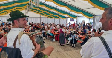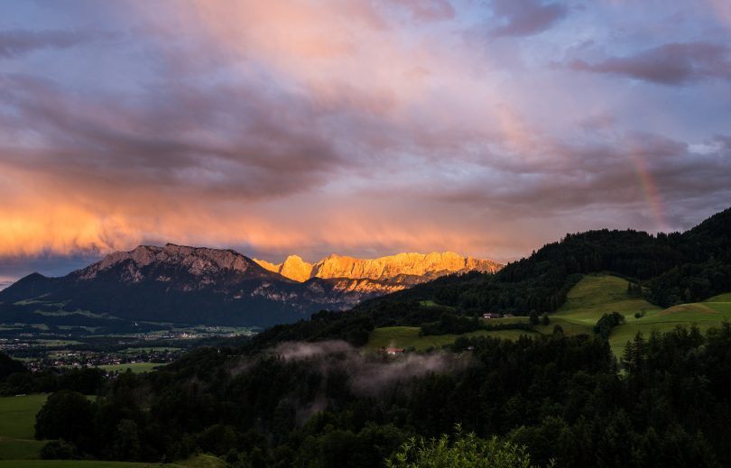 Dem Kaisergebirge alle Ehre machte am jüngsten Sonntag das Wetter. Gelb-golden leuchteten die Wolken, ein kleiner Regenbogenrest fügte sich ebenso ein und das Kaisergebirge strahlte kräftig zurück – dieser abendliche Anblick ergab sich von Oberaudorf aus als Gast vom Restaurant Hummelei.