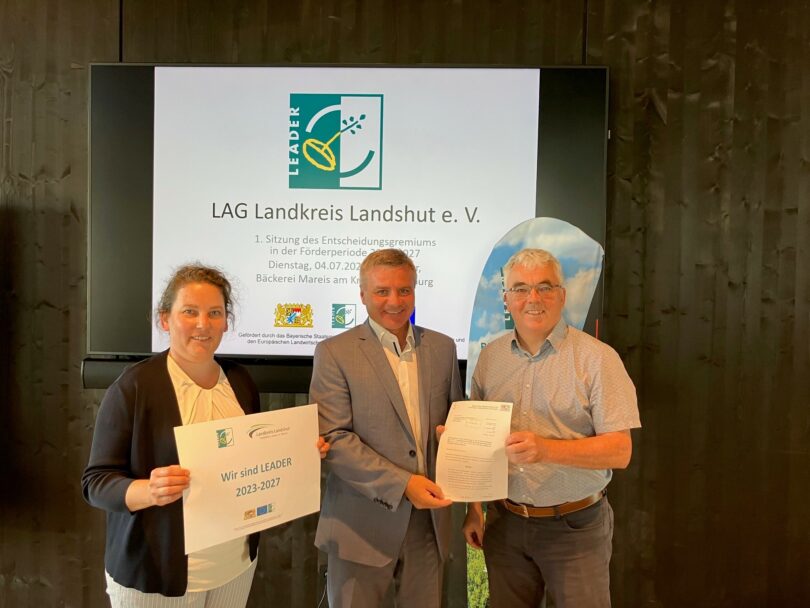Bericht und Foto: LRA Landshut – v. r.: LEADER-Koordinator Dr. Eberhard Pex überreichte Landrat und 1. LAG-Vorsitzenden Peter Dreier sowie LAG-Geschäftsführerin Karoline Bartha den Förderbescheid des EU-Programms der Förderperiode 2023-2027.