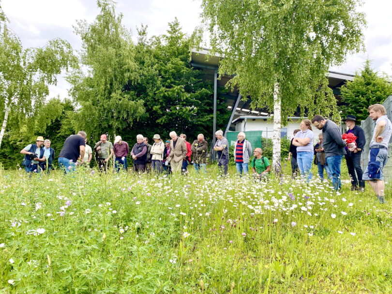 Bericht und Foto: LRA Landshut – Die Teilnehmerinnen und Teilnehmer der Naturschutz-Exkursion bei der Besichtigung der artenreichen Blühwiese an der Schulsportanlage in Rottenburg – ein wichtiger Lebensraum für gefährdete Pflanzen wie den Ackerwachtelweizen.
