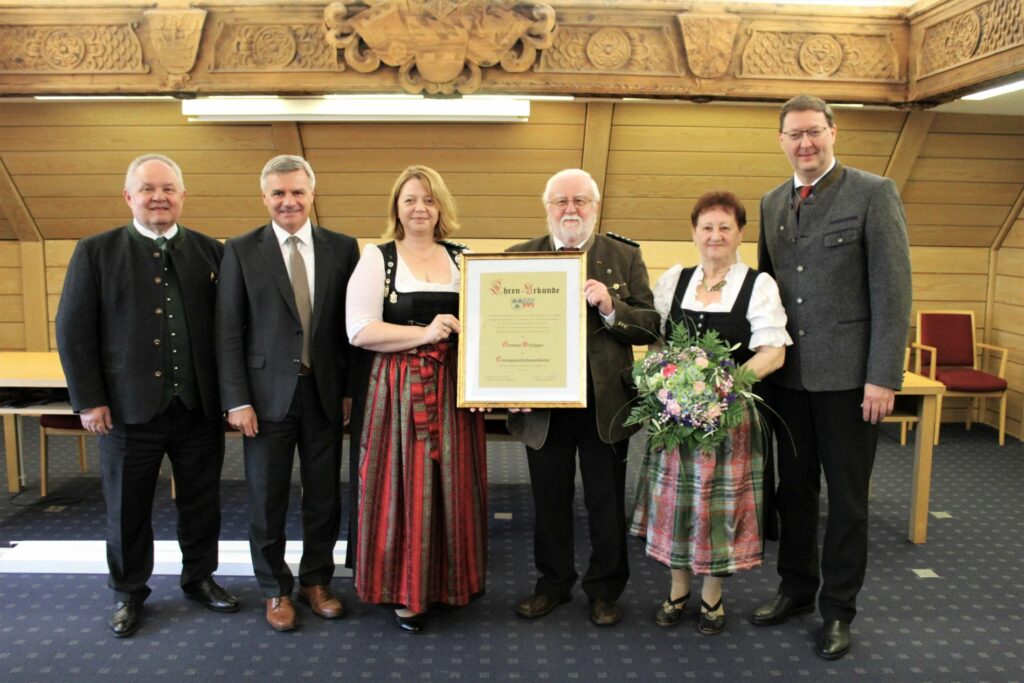 Heinke Gschlößl, 1. Gauschützenmeisterin des Schützengaus Landshut, (3. v. l.) überreichte Gerhard Schipper (3. v. r.) seine Ernennungsurkunde zum Ehren-Gauschützenmeister. Mit dabei waren (v. l.) Hans Haintaler 2. Landesschützenmeister, Schippers Ehegattin Christl und 1. Landesschützenmeister Christian Kühn.