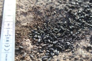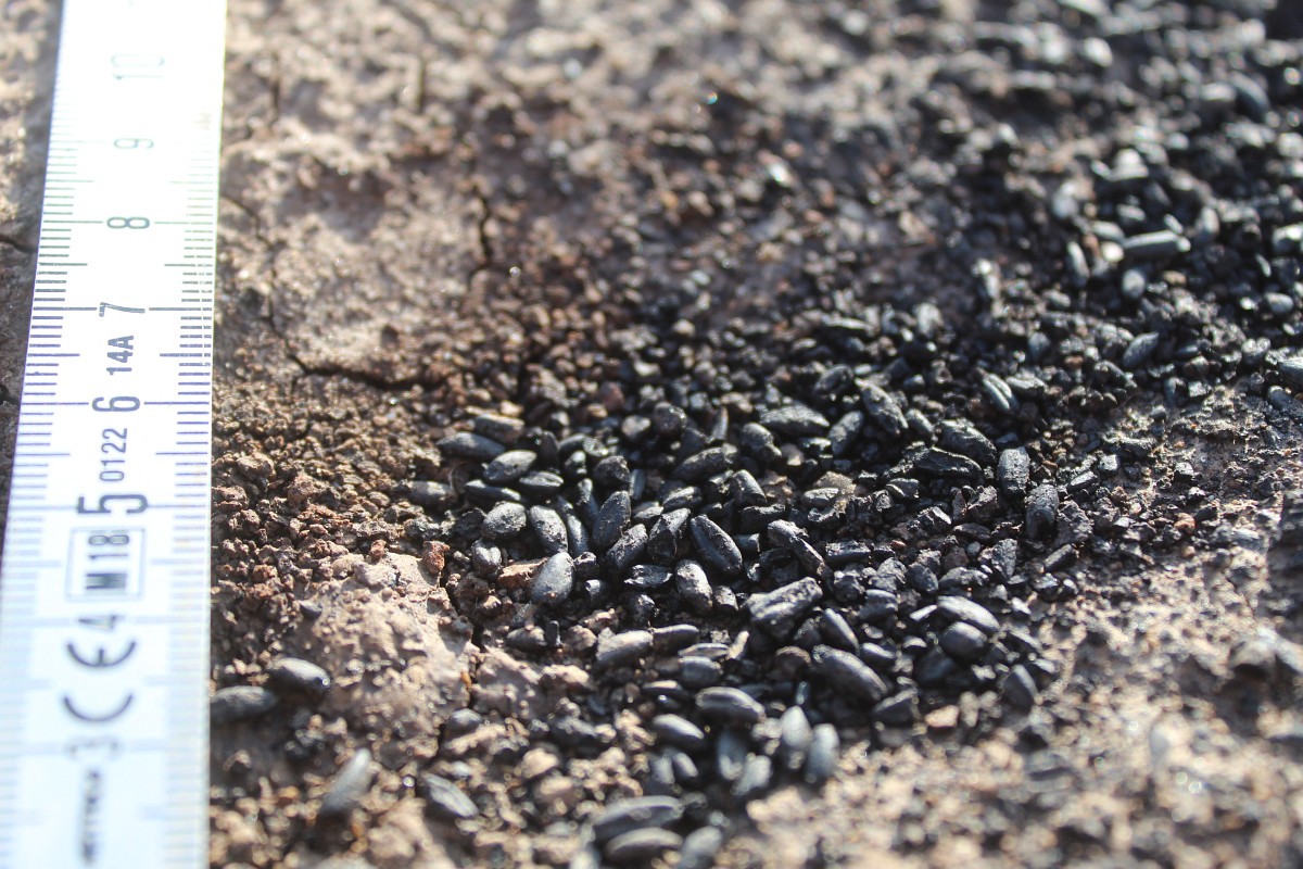 Der steinzeitliche Getreidevorrat während der Ausgrabung (Foto: Kreisarchäologie Landshut).